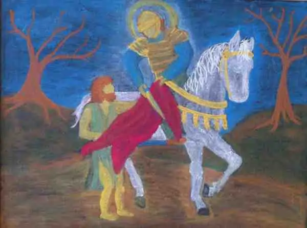 Un día, el Tribuno Martín se encontraba a las puertas de Amiens. Montaba un fino caballo y sobre la armadura vestía una fina capa roja. Los soldados de infantería estaban cruzando la entrada de la ciudad. Cerca de ellos un mendigo casi desnudo, en cuclillas sostenía un cuenco. El día era frío, y se estremecía mientras pedía caridad. Pero nadie lo escuchaba, o si lo hacían, era sólo para lanzarle una mirada desdeñosa, una palabra áspera o una patada. Había tantos mendigos en esos tiempos, que su presencia era molesta.