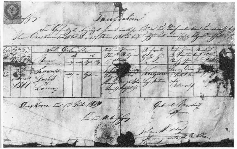 Al nacer estaban presentes (además de la madre y el padre); Laurentius Diem (el jefe de estación) y su esposa Josefa Jakl (los padrinos); y una partera. Esta última corta el cordón umbilical a nivel del ombligo. Por alguna razón, este cordón umbilical fue mal cortado, y esto resultó en una hemorragia tan severa que los padres, sin dudarlo, decidieron hacer un bautismo de urgencia; que consiste en que un católico bautizado simplemente pronuncie estas palabras: “Yo te bautizo en el nombre del Padre, del Hijo y del Espíritu Santo”. Porque ya era medianoche, o poco antes; y no querían que el recién nacido muriera sin ser bautizado.
