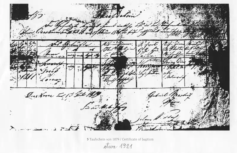 Existen dos fotografías de este certificado de bautismo recién emitido y corregido: una data del 1 de febrero de 1914, cuando Rudolf Steiner le pidió a Max Benzinger que lo fotografiara; la segunda proviene de los años 1918 a 1920, de la llamada Época de la Trimembración, cuando Rudolf Steiner fue acosado y confrontado con salvajes sospechas e insultos. En ese momento, el certificado de bautismo fue nuevamente fotografiado por Benzinger. De esa fotografía, incluso se entregaron copias a los miembros que asistieron a las conferencias de la trimembración. Tenían así a la mano, si era necesario, una prueba concreta de que Rudolf Steiner había recibido un bautismo y una educación cristiana. (9)