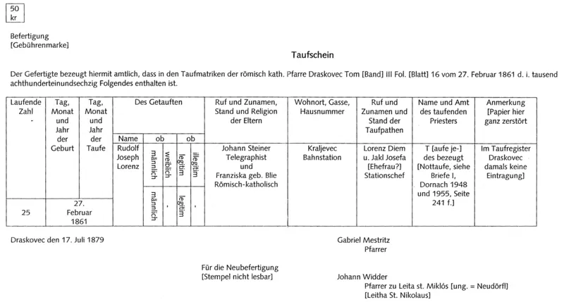 Al segundo día, el bautismo propiamente dicho se realizó en la iglesia de Draskovec. El sacerdote de guardia, Gabriel Mestritz, escribió el 27 de febrero de 1861 en el registro de Bautismos, el nacimiento y el bautismo de “Adolphus Laurentius Josephus Steiner”. En el lugar de nacimiento, indicó “Kraljevec 24”, y finalmente en el nombre del sacerdote autorizado que asistía al bautismo, escribió: “Gabriel Mestritz”.